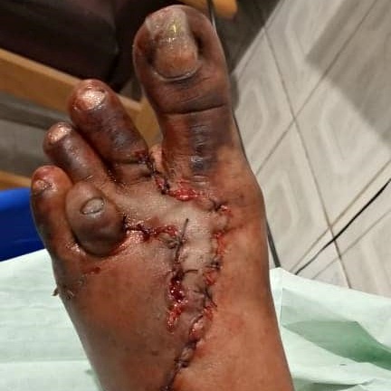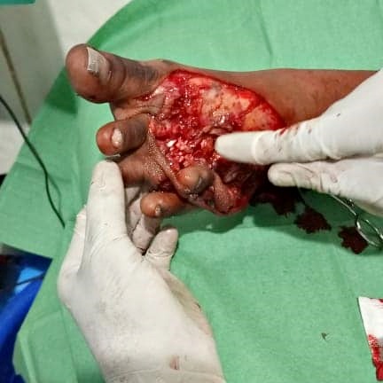 L’équipe chirurgicale de TVC Medical réalise une chirurgie plastique sur le pied d’une accidentée de taxi moto. Pour cette intervention, l’équipe est conduite par Dr Muyaya Albert, Médecin Chef de Staff et Dr Ntumba Olivier.