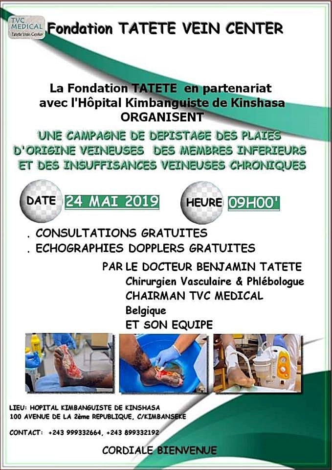 Parce que le MBASU des membres inférieurs résulte d’une maladie veineuse que la médecine moderne soigne, TVC Medical organise deux séances de dépistage gratuites dans les lieux suivants à Kinshasa: