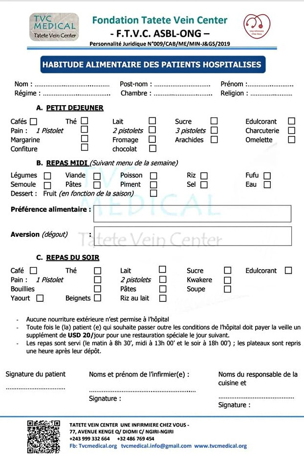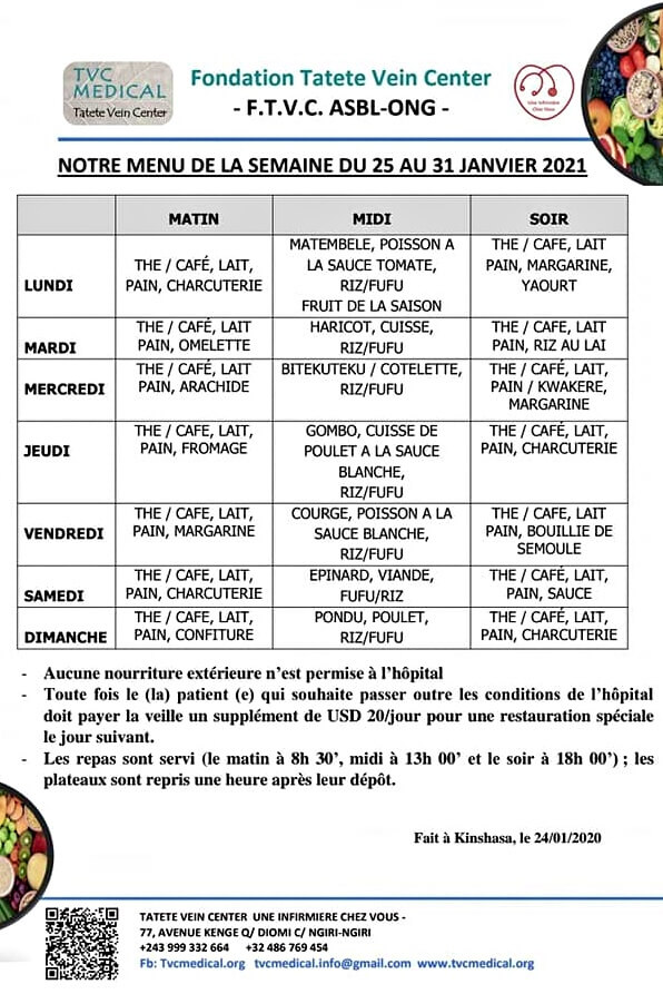 A TVC Medical, la restauration des patients en résidence est assurée par le service diététique spécialisé du centre hospitalier. La prise en charge des soins nutritionnels s’effectue en lien avec les équipes médicales et infirmières. Les situations d’obésité, de diabète et les maladies vasculaires liées aux déficiences alimentaires (carences, malnutritions, etc.) font l'objet d'une attention particulière. Equilibrée, l’alimentation proposée tient compte du régime alimentaire médicalement conseillé, dans le respect de la religion du patient ainsi que de ses habitudes et préférences alimentaires. Sauf exception strictement encadrée, la nourriture extérieure est interdite de manière à non seulement garantir l’hygiène et la sécurité dans l’hôpital mais aussi de fluidifier l'organisation en veillant au respect des horaires du repas.